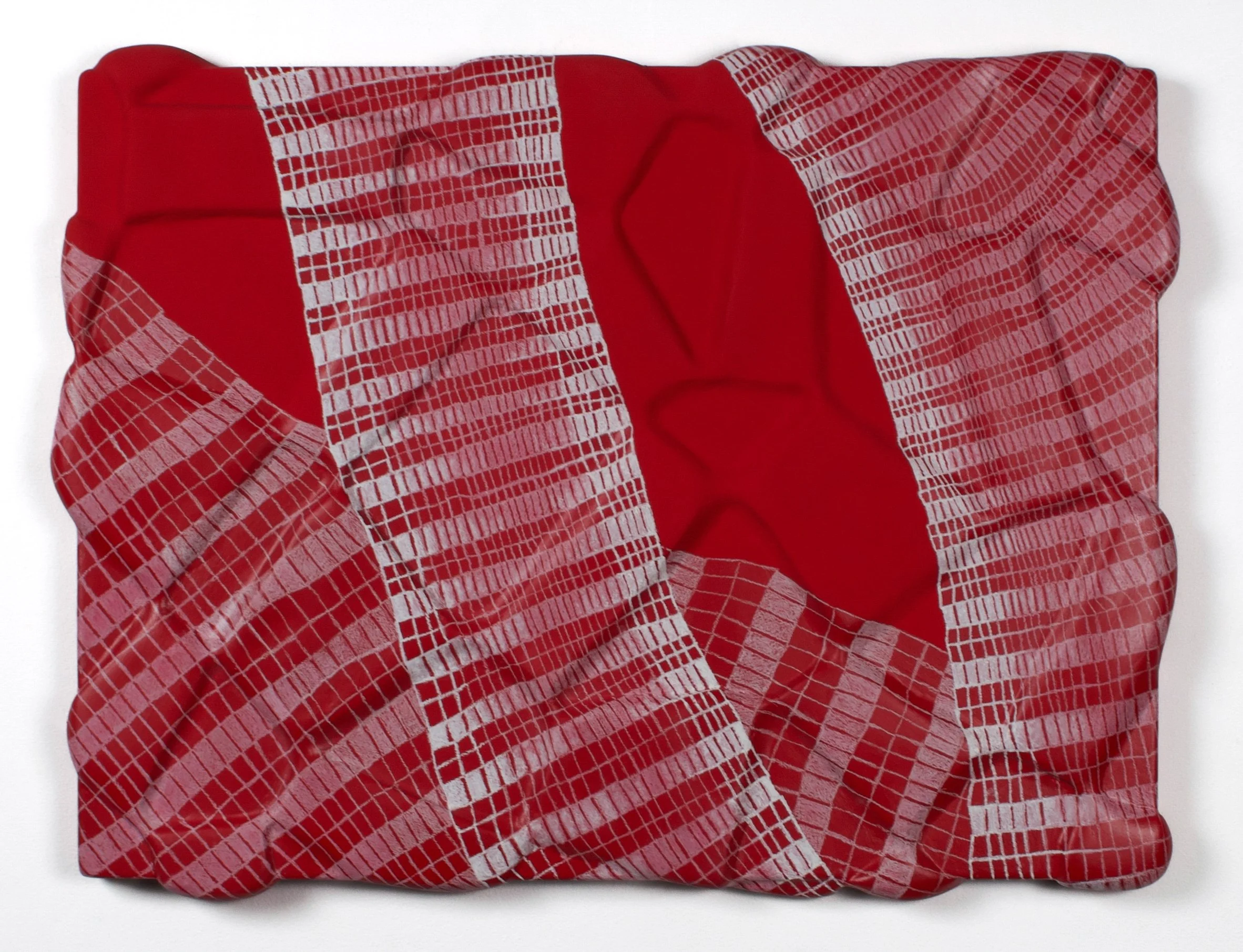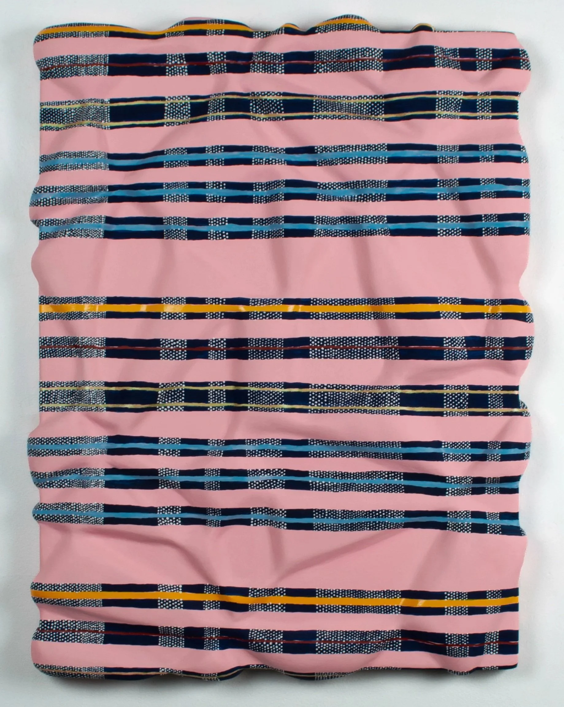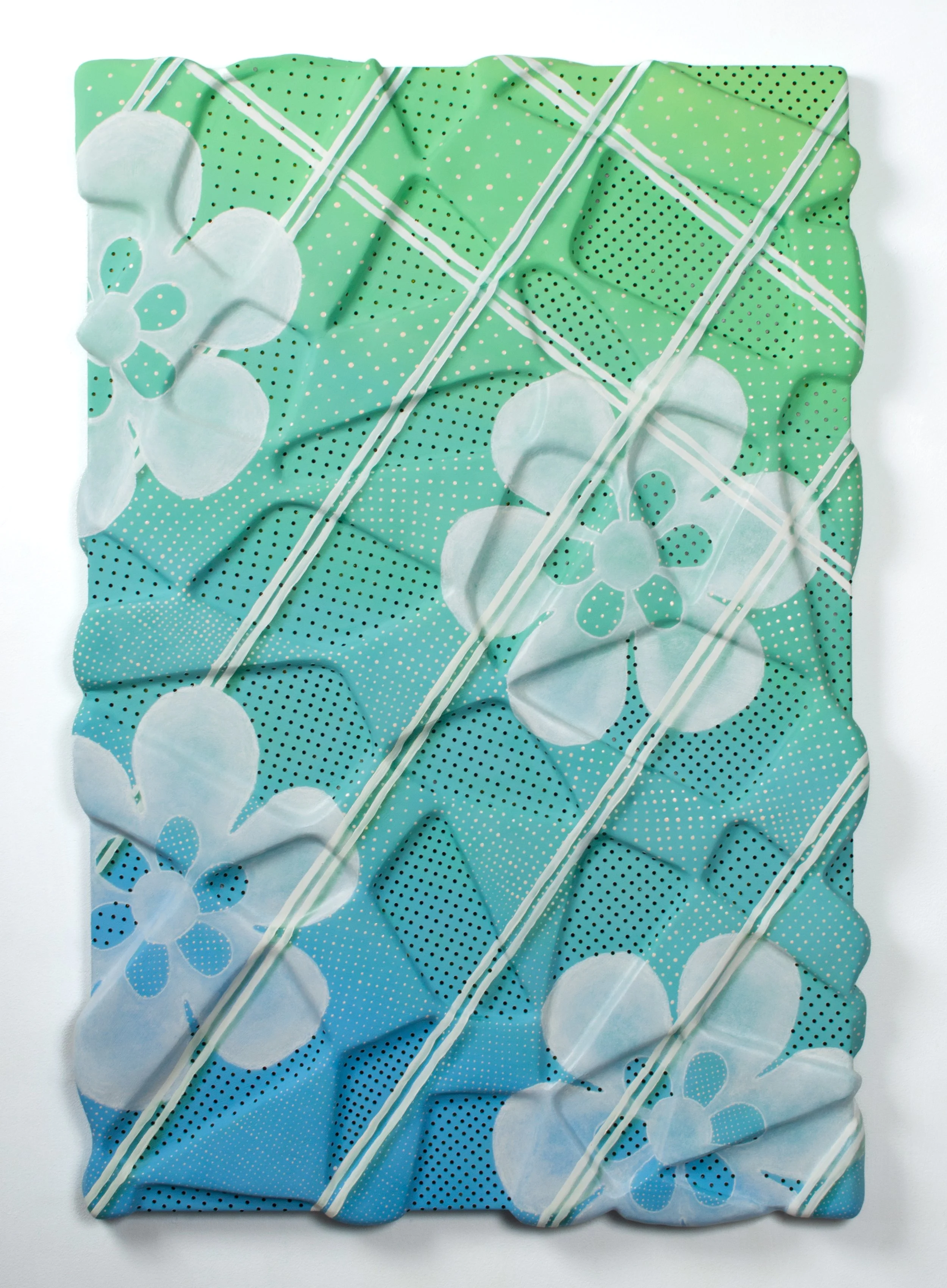 “Quilt Patterns” is an ongoing series of low relief paintings that are translations of patterned fabrics from crazy quilts that my grandmother and great-great grandmother made. The quilt is composed of various shapes and sizes of fabric scraps that my great-great grandma collected from her family over many years; she sewed them into large squares and then years later my grandma made the squares into multiple quilts. The patterns on the quilts repeat, to create these pieces I select specific patterns and trace all the shapes of the fabric pieces they are on. Next, I create an organic grid-like structure with mâché clay on a panel from these shapes by connecting them at the corners. This produces an undulating surface that is painted with matte paint and the fabric patterns are